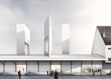 In einer alten Lagerhalle soll das neue Kunsthaus Baselland entstehen. Mit drei schlanken Betontürmen stützen > Buchner Bründler das fragile Tragwerk und setzen ein Zeichen, das von weithin sichtbar ist.