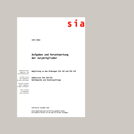 In den beiden Ordnungen SIA 142 für Wettbewerbe und SIA 143 für Studienaufträge ist die Verantwortung der Jury kurz und bündig festgelegt. Demnach sind die Jurymitglieder der Auftraggeberin und den Teilnehmenden gegenüber dafür verantwortlich, dass der Wettbewerb respektive der Studienauftrag ordnungsgemäss durchgeführt wird. Was diese einfache Bestimmung bedeutet und wie sie in der Praxis anzuwenden ist, erläutert die Wegleitung «Aufgaben und Verantwortung der Jurymitglieder», die im Dezember 2010 publiziert wurde.