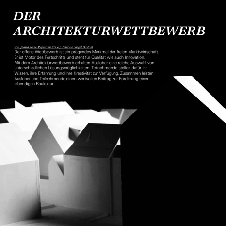 Der offene Wettbewerb ist ein prägendes Merkmal der freien Marktwirtschaft. Er ist Motor des Fortschritts und steht für Qualität wie auch Innovation. Mit dem Architekturwettbewerb erhalten Auslober eine reiche Auswahl von unterschiedlichen Lösungsmöglichkeiten.